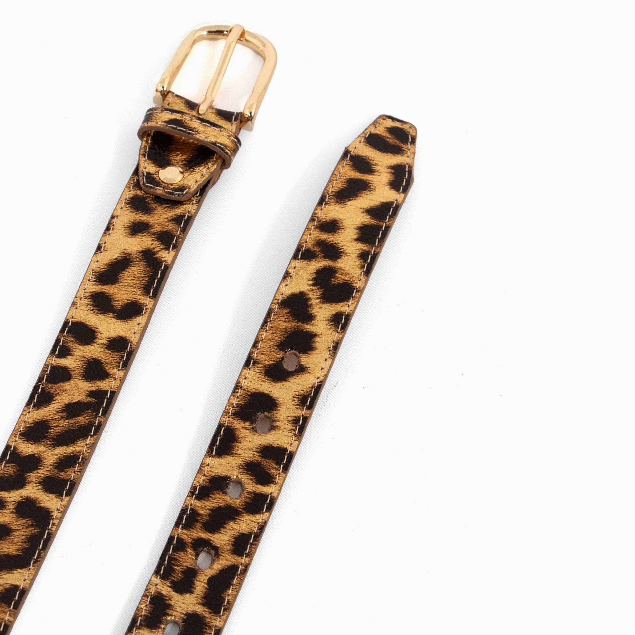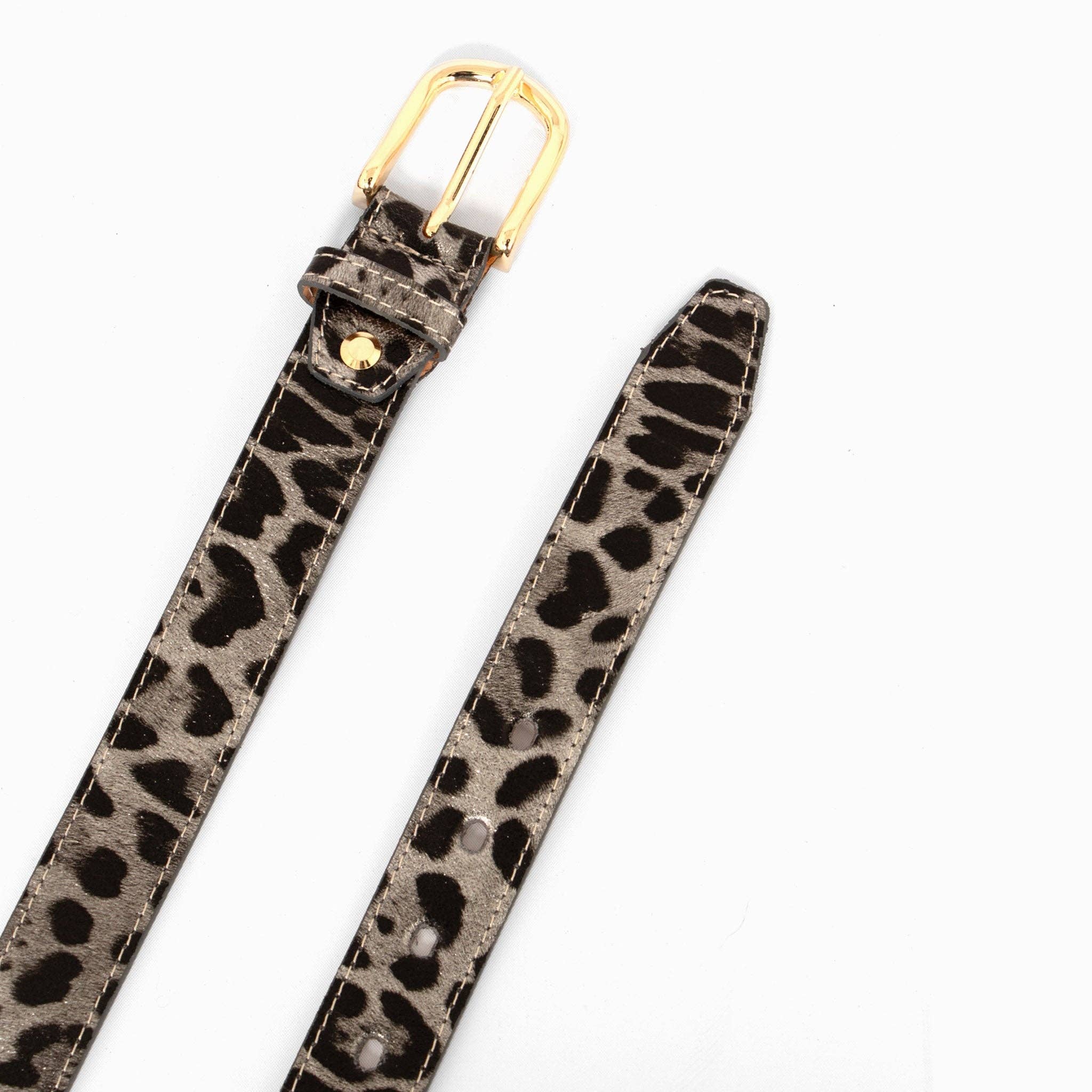 A classic belt crafted from grey leopard print Italian leather. This belt is fully adjustable to suit your preferred comfort. Finished with a classic gold buckle and pin. Easily accessorise with your favourite jeans. Belt Gold hardware