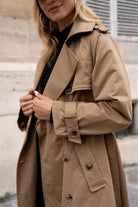 Long trench coat with double-breasted buttons, adjustable belt, notched collar, and wrist straps. Perfect for functional elegance.
