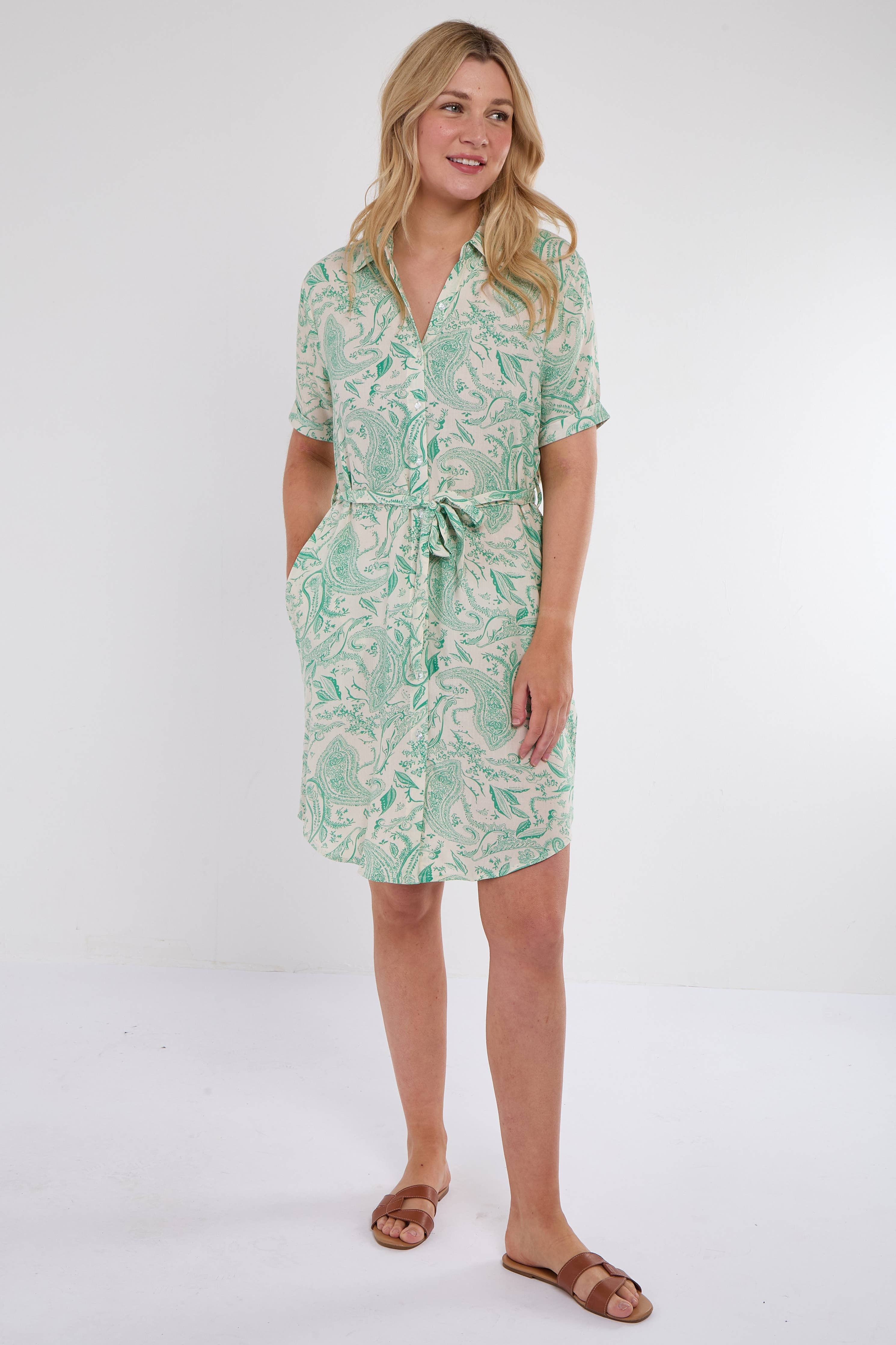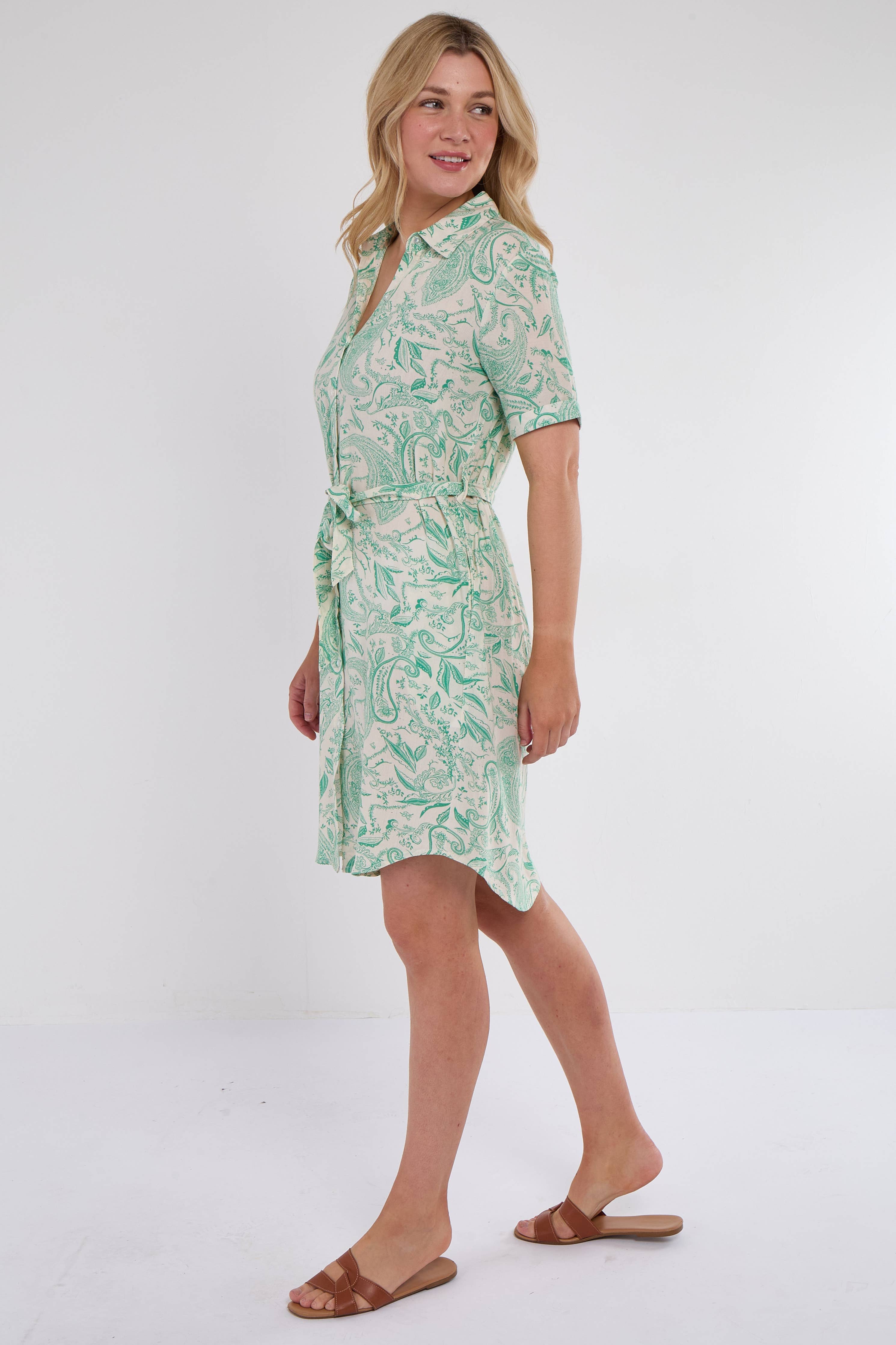 Chic blue or green mini shirt dress adorned with an intricate paisley print, featuring short sleeves, a button-down front, and a tailored silhouette. Ideal for casual lunches, weekend get-togethers, or warm-weather outings.