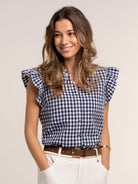 Navy and white gingham brings a classic summer feel to our Bia Blouse. Designed with a relaxed shape, it features a button-through notch neckline with soft ruffle detail and gently ruffled cap sleeves. Pair it with our Aitana Shorts or Teresa Dress for an easy summer outfit.