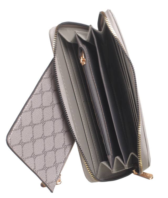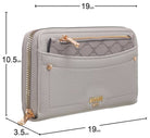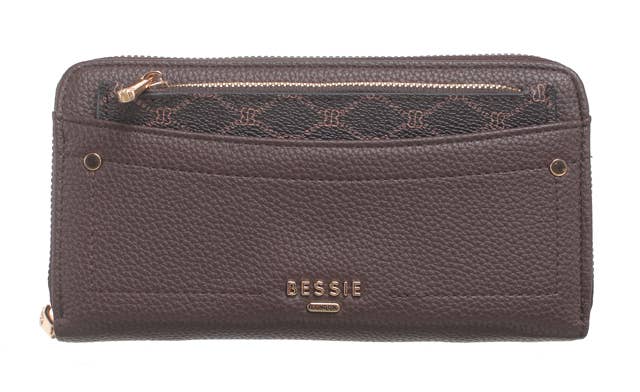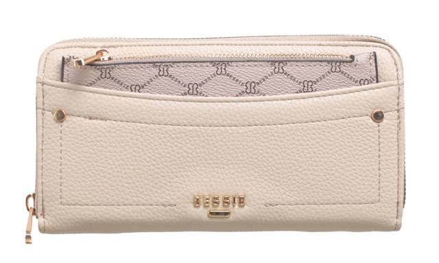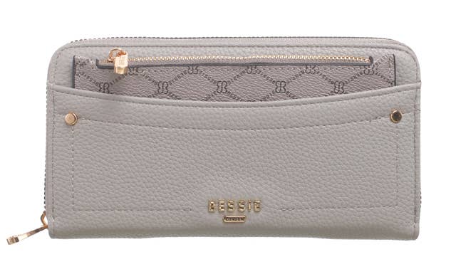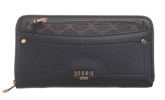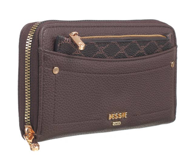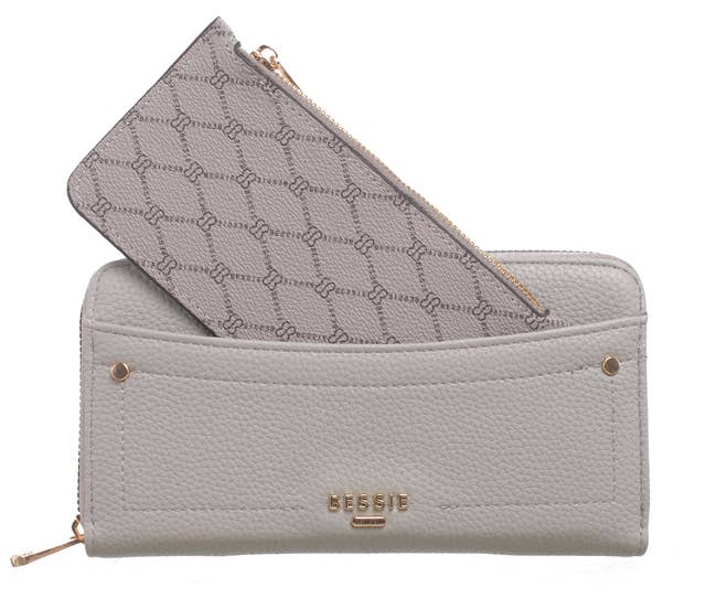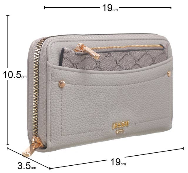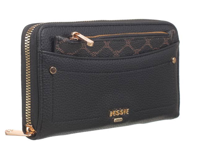 Features: Purse | Interior Card Slots | Zip Closure | Lady Wallet | Monogram | Coin Bag | 2 In 1 Dimensions: L: 19cm | H: 10.5cm | W: 3.5cm Fabric: outer: High quality PU | Inner: Polyester. Item contains a Bessie London paper box. Washing & Care:To clean, wipe with a damp cloth. Do not place next to similar fabrics / bold colours in warm places to insure colour does not transfer.
