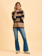 Sailor stripes meet cosy comfort in the Bay Jumper. Featuring tapered sleeves with long ribbed cuffs edged in burgundy, a ribbed roll neck, and a medium-weight knit. With side slits and a dropped back hem, it styles well with slim-fit jeans.