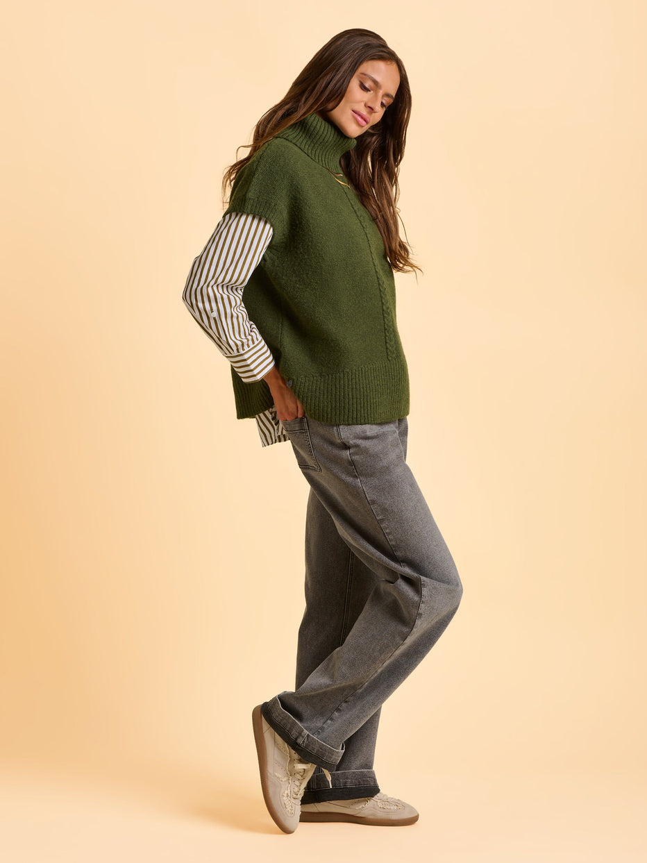 With its roll neck and boxy fit, the Mariner Tank is made for layering. Featuring a horseshoe knit detail down the centre and thick ribbed edges, the design is an understated staple . A mid-weight piece that adds warmth (and edge) to winter looks. Style with a striped long sleeve tee.