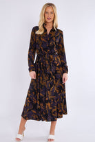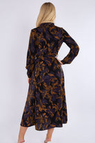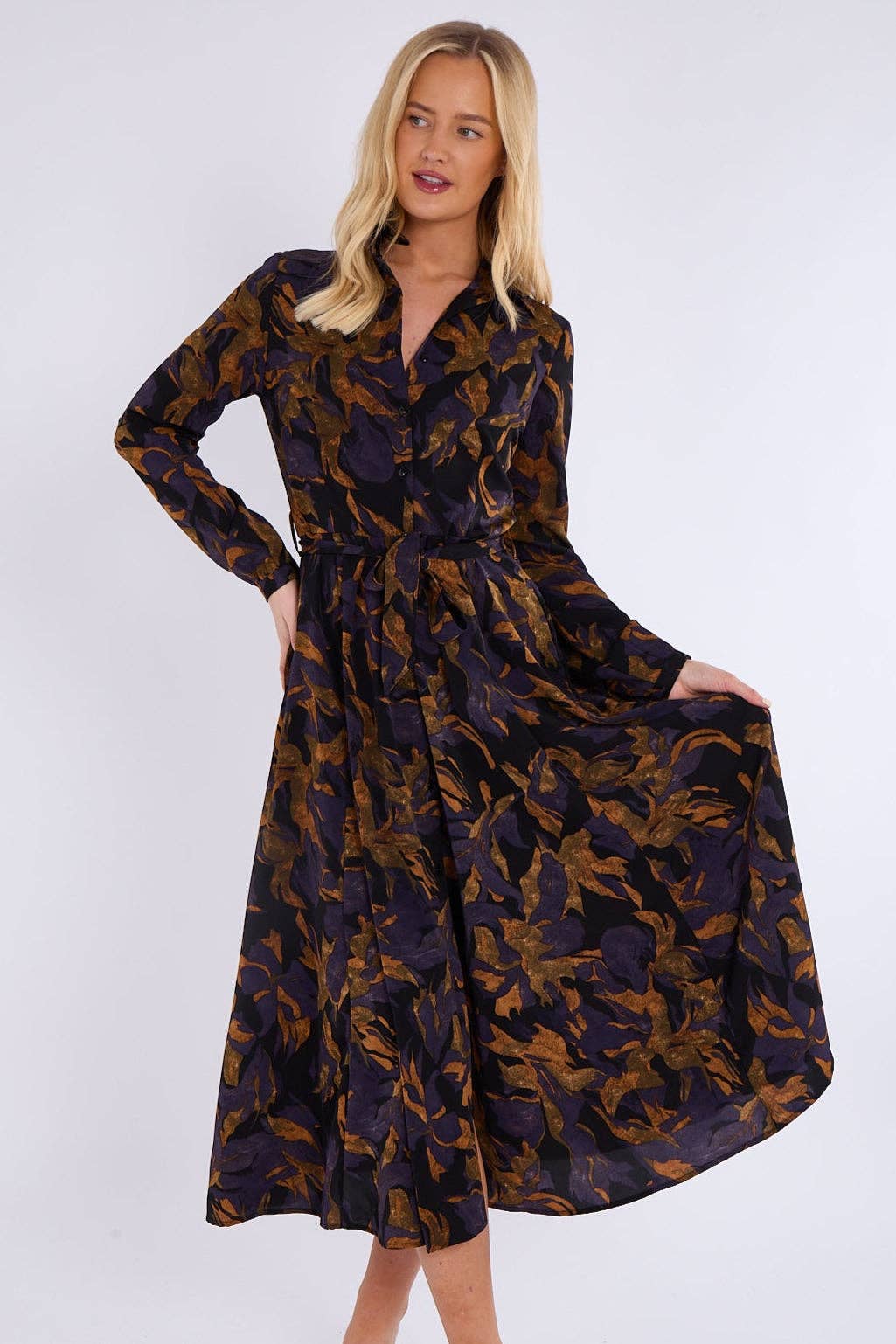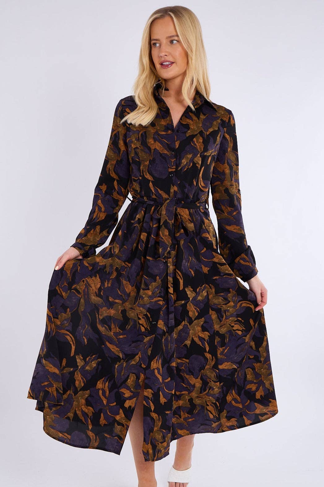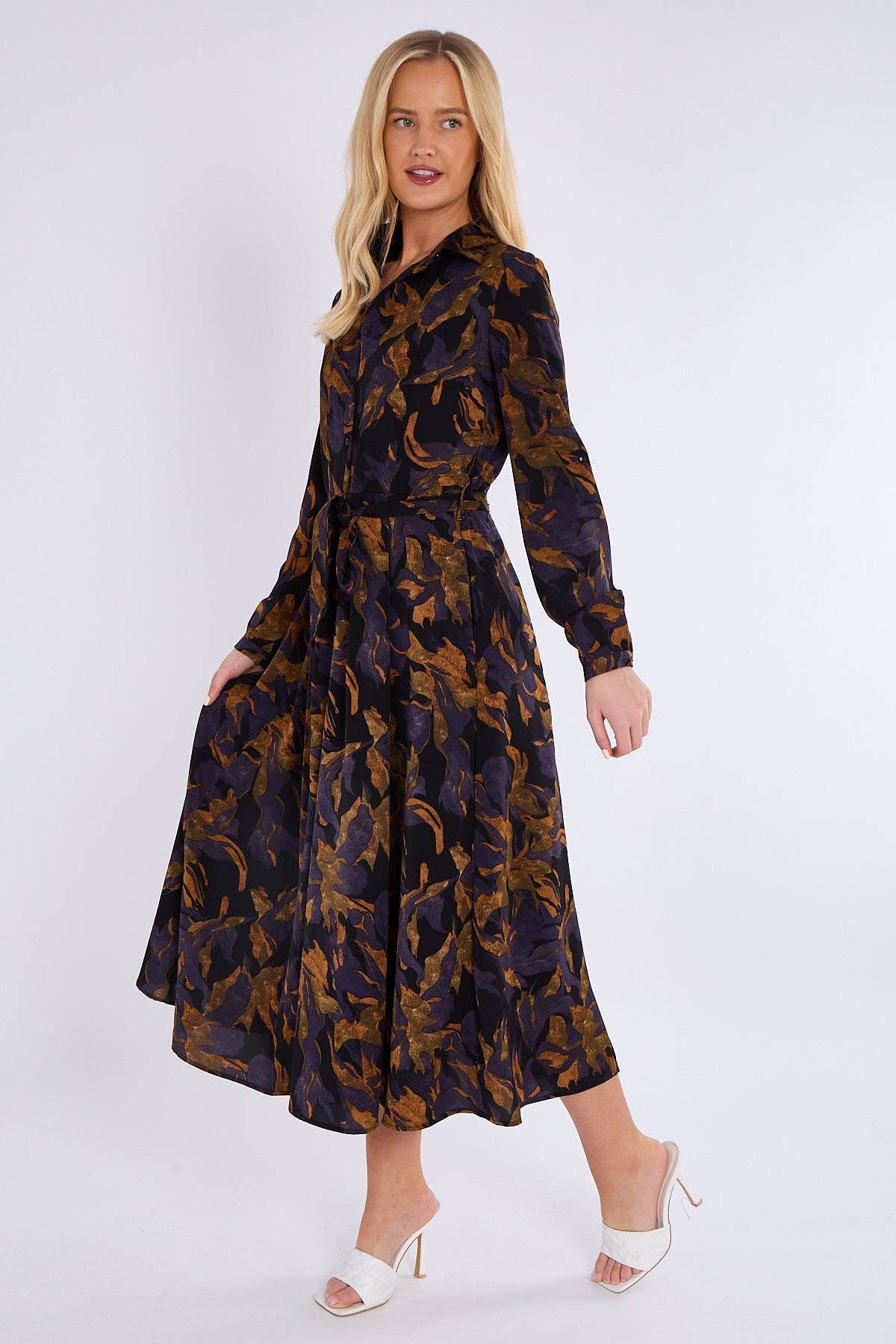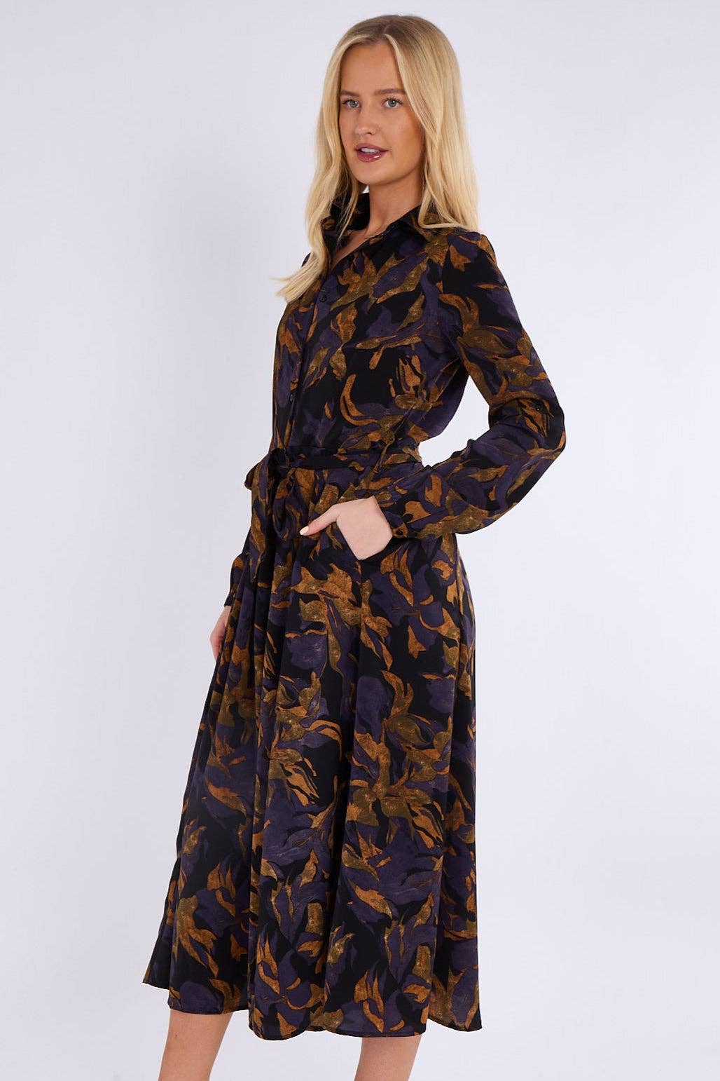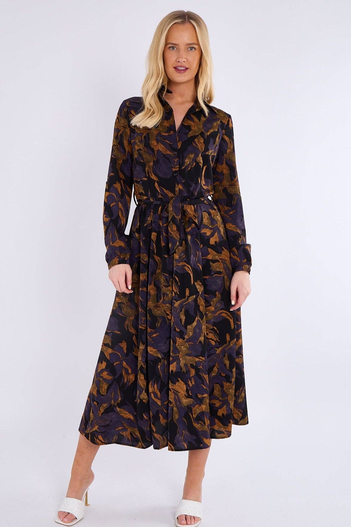 This stunning purple bronze abstract print midaxi shirt dress combines elegance with contemporary flair. Featuring a classic button-down front, a flattering waistline, and two practical side pockets, it offers both style and functionality. The rich color palette and abstract design make it a standout piece for any occasion. Perfect for brunches, evening dinners, work events, or special gatherings. Pair it with heels for a sophisticated look, ankle boots for a chic edge, or flats for effortless everyday wear.