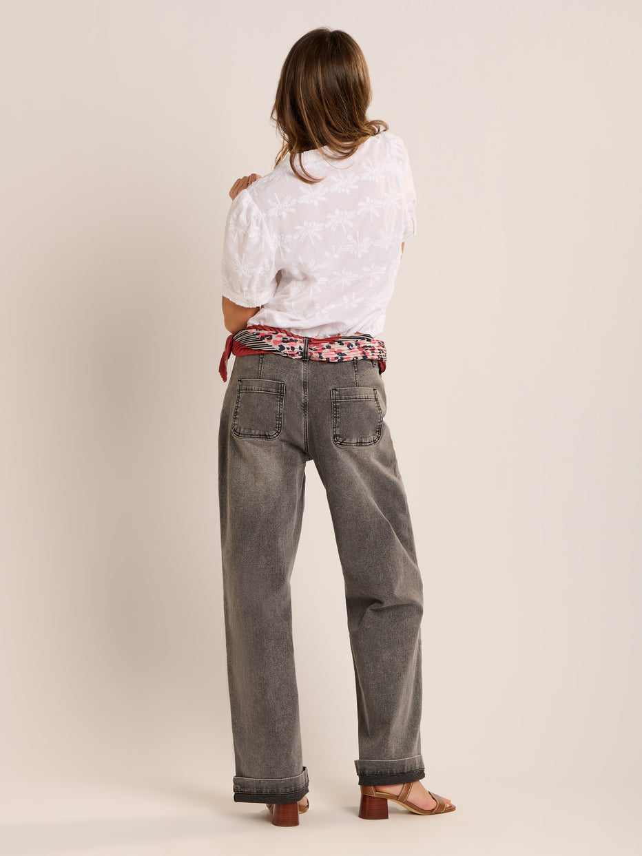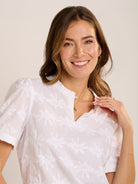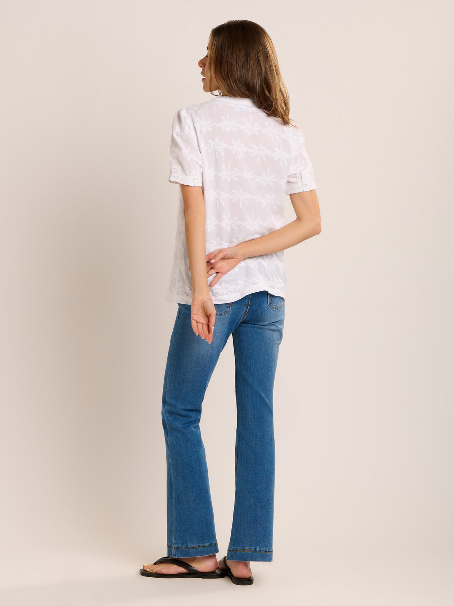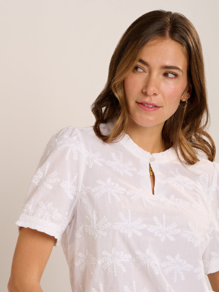 Holiday vibes, the Vanessa blouse has these in abundance. Soft white cotton with an all over palm tree embroidery design. Ruffled neck with key hole and mock mother of pearl button fastening, ruffles at the cuff with a button fastening.