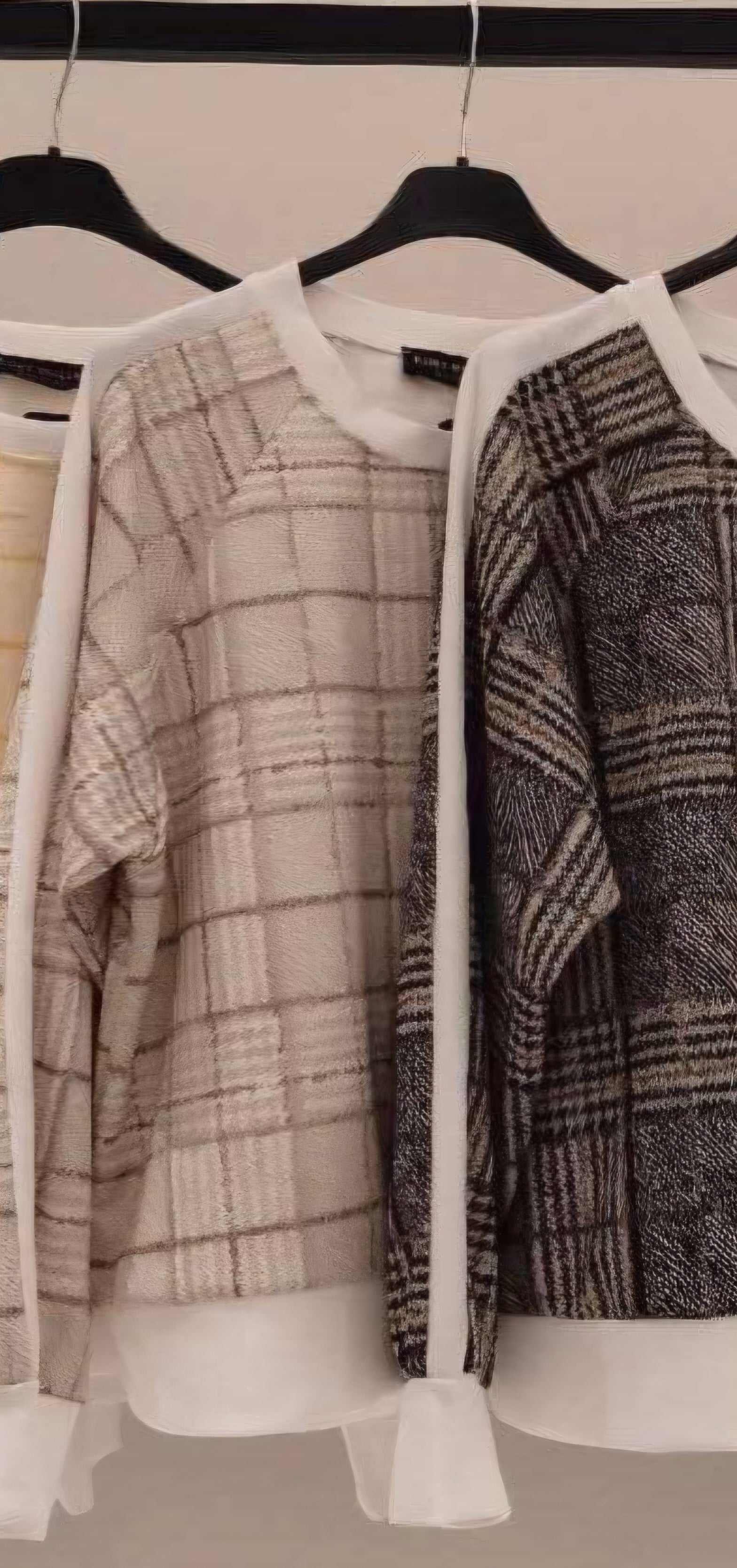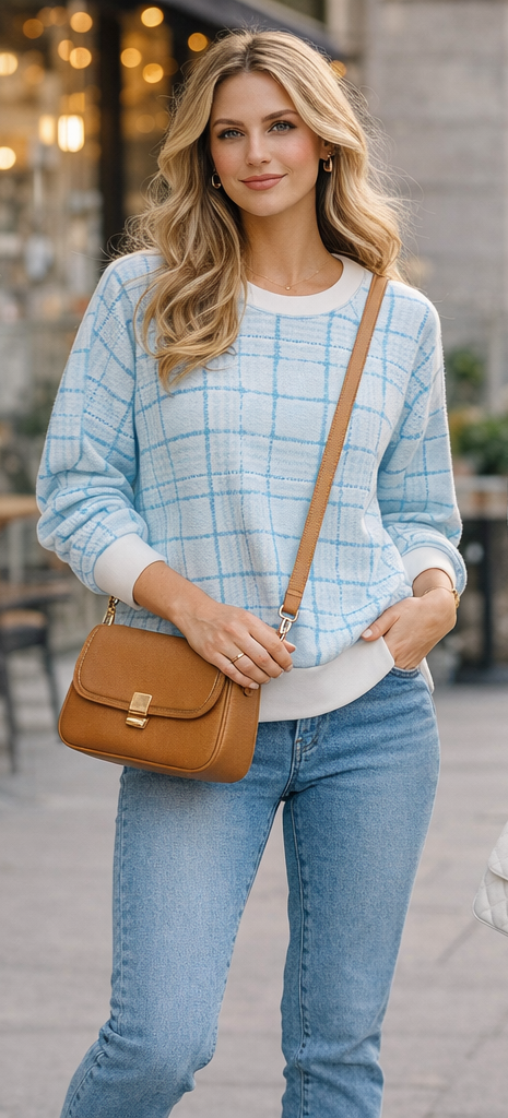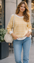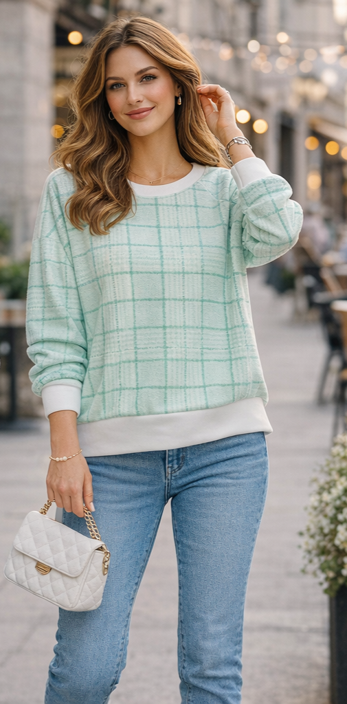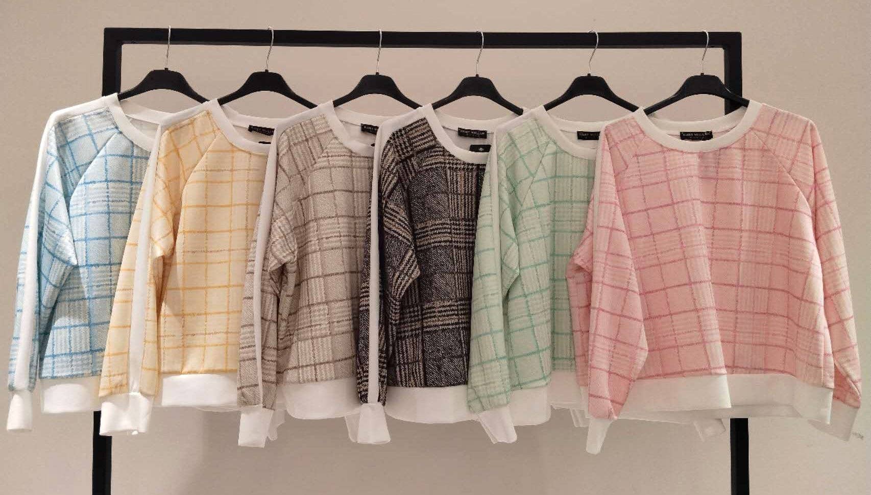 Check plaid print lightweight sweatshirt top. Contrast crew neck, long sleeves with white cuffs and white hem. Trendy and stylish. Team with our jeans or wide leg trousers. Lightweight relaxed fit One size 8-14