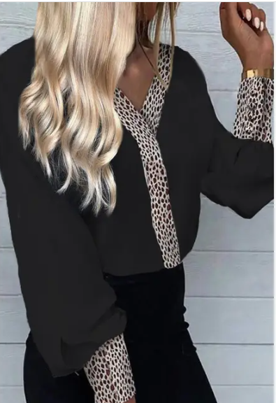 Ciara Contrast Leopard Print Blouse Shirt Top-Black