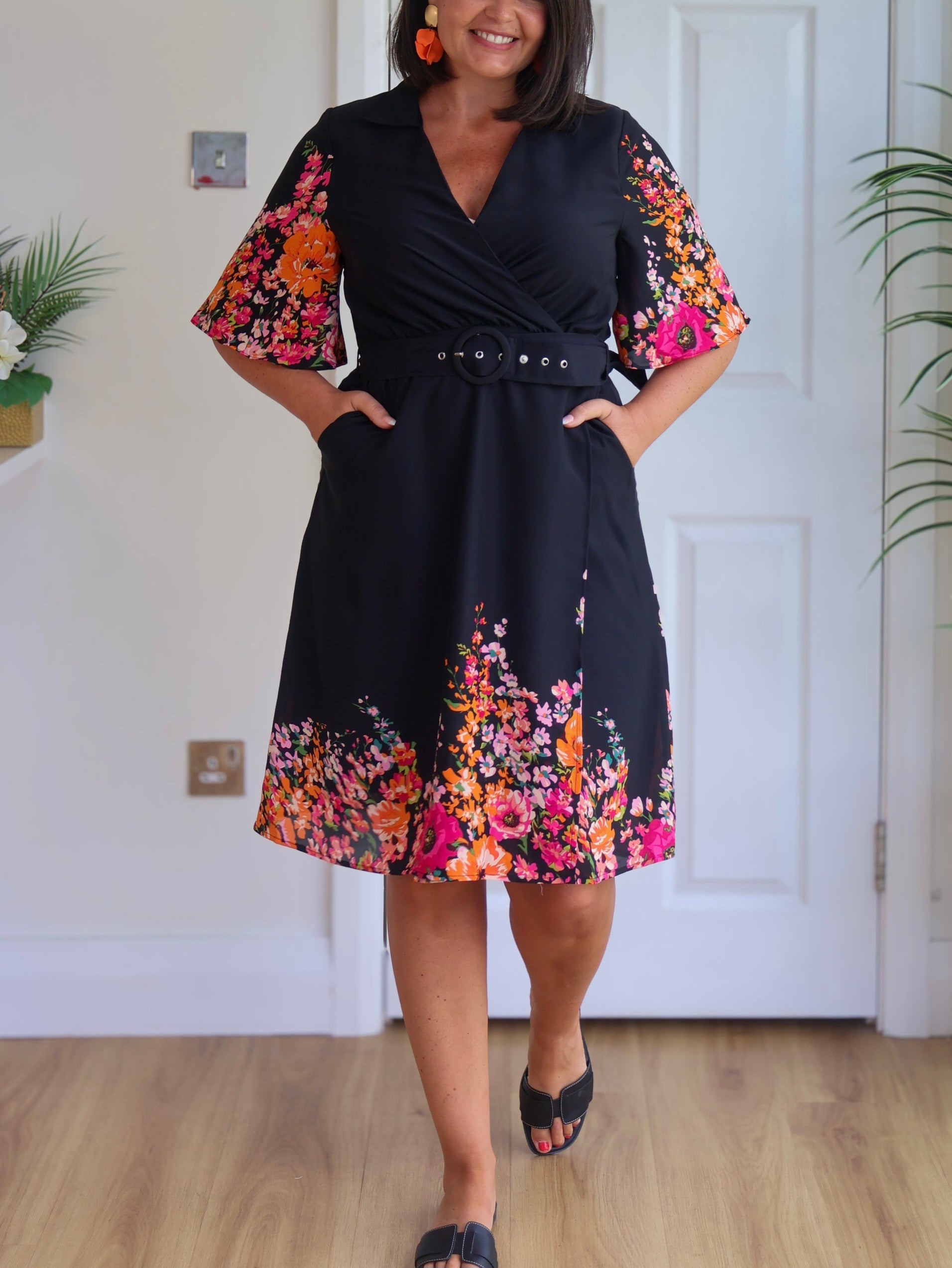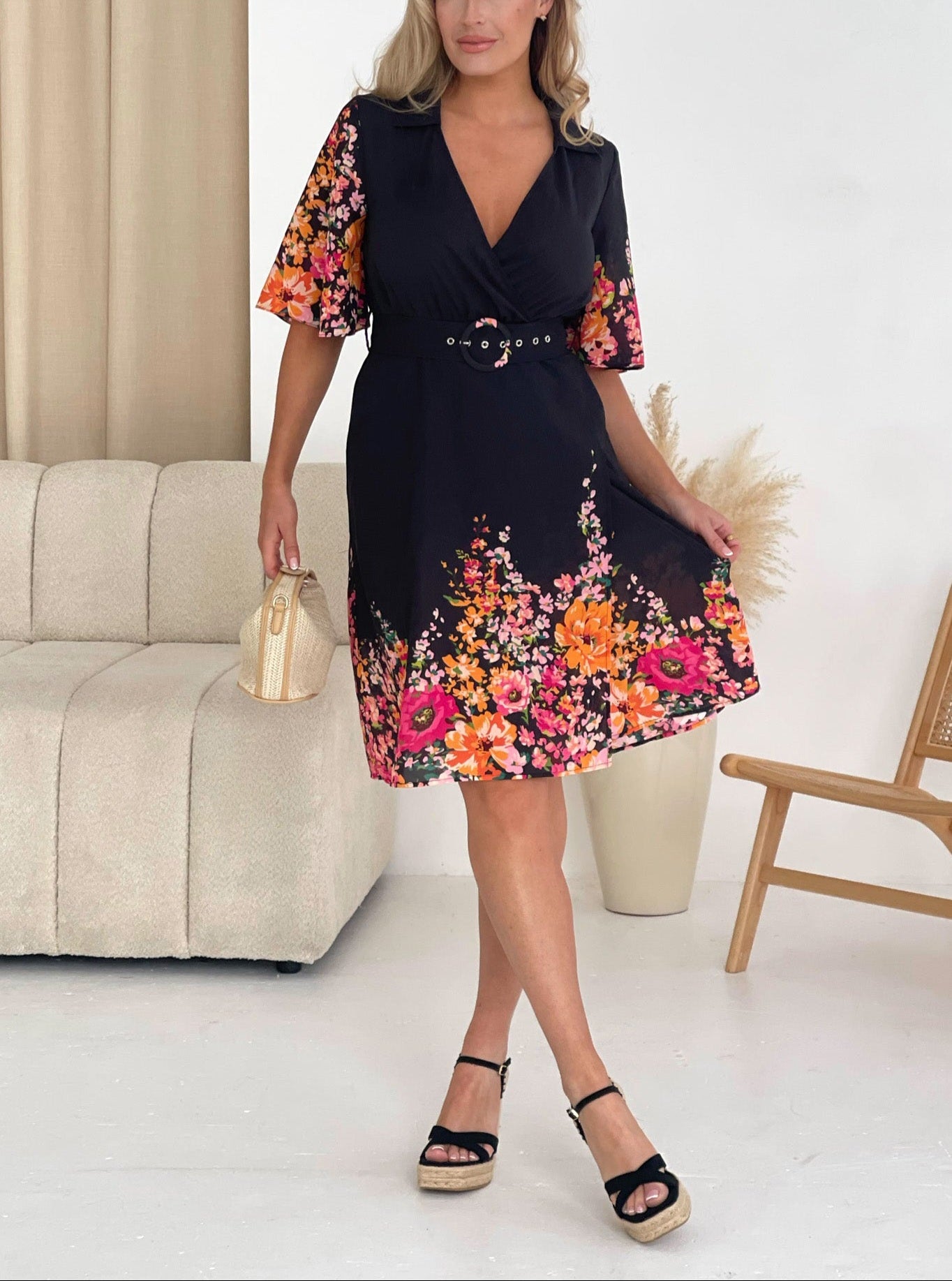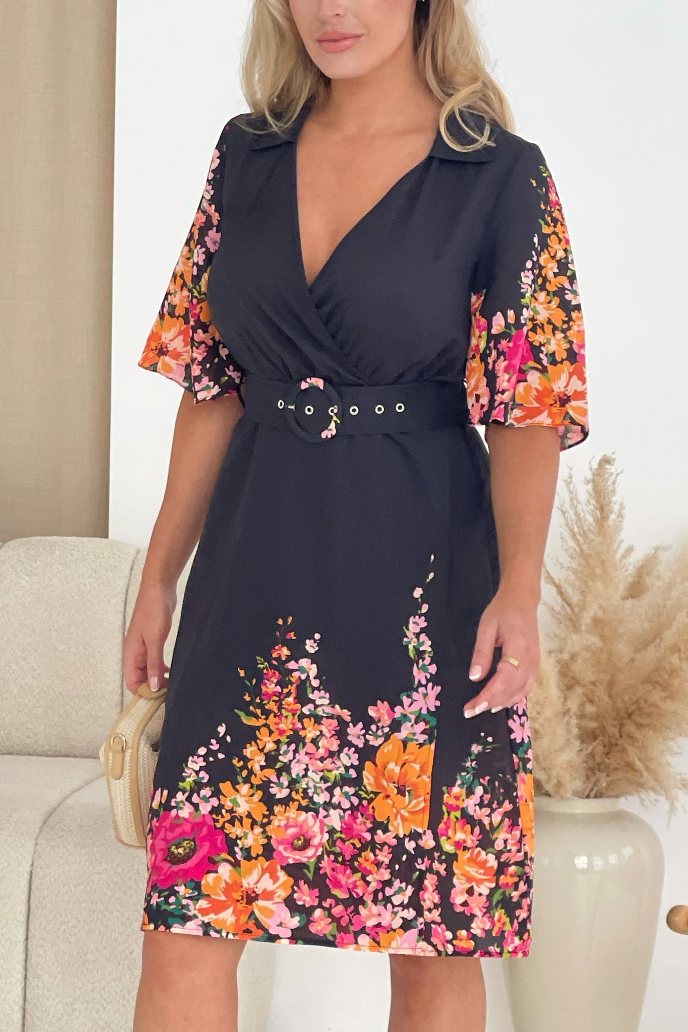 Experience the elegance and grace of the Karen Border Print Mini Shirt Dress. This stunning, knee-length dress features a flattering cut and a beautiful floral border print that will make you stand out in any crowd. Complete the look with the included matching belt. Elevate your style and turn heads with this must-have dress!