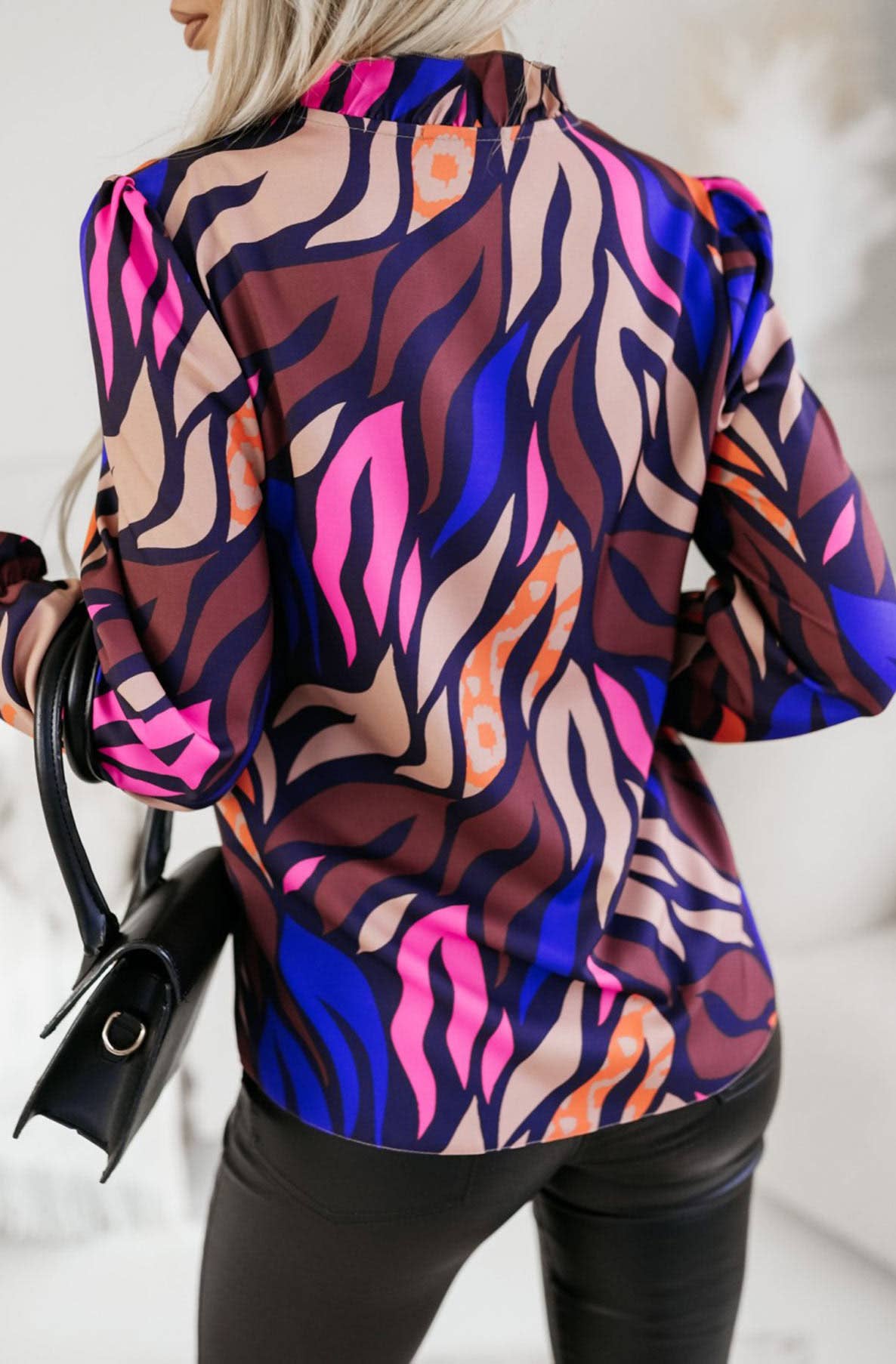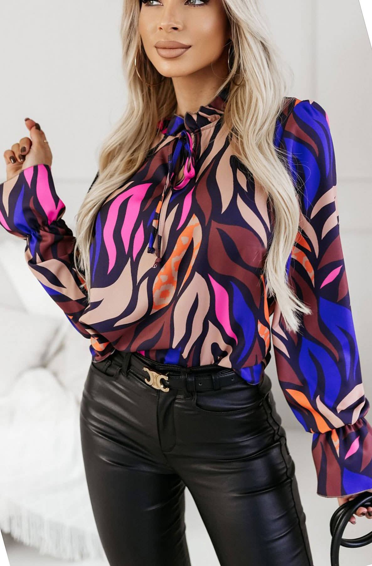 Indulge in this stunning and trendy blouse top, perfect for the summer season. Featuring a high neckline with a front tie-up detail. It's unique multi-coloured abstract pattern will surely make a statement. Keep comfortable with its soft and stretchy fabric, and style it with confidence with its long sleeves and elasticated cuffs. Available in approx. sizes of: S UK 8), M (UK 10), and L (UK 12) with an approximate length of: 26"(67cm). This top is a must-have addition to your wardrobe. Made in Italy with 100% Polyester - it's a versatile piece that will elevate any outfit.